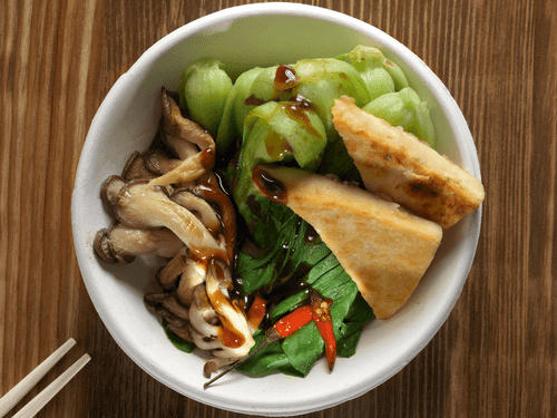 Place the salad in a deep plate, add tofu on top, and arrange the oyster mushrooms beside it. Dress the salad with the remaining sauce.