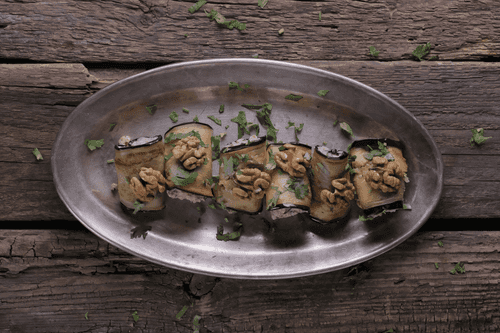 Place the filling on half of the eggplant and roll it into a roll. Put it on a plate. Do the same with the remaining eggplants. You can spread the leftover filling on the eggplants and sprinkle with pomegranate seeds.