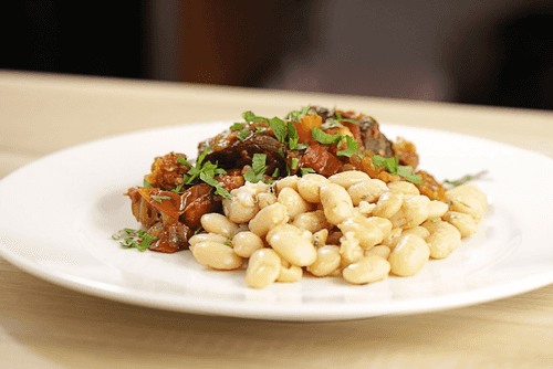 We cook for about an hour. The beans are ready. We serve it with veal shank stewed with tomatoes and red wine.