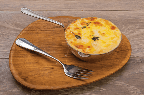 Place the chicken with mushrooms and garlic in a cocotte, pour with béchamel sauce, sprinkle with cheese, and bake in a preheated oven at 200 degrees for 5 minutes.