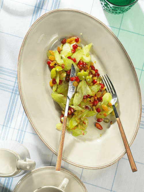 Heat olive oil in a large saucepan, add sugar, capers, raisins, vinegar, a pinch of black pepper, and olives, and simmer on medium heat for five minutes. Then add celery to the saucepan and simmer for another two to three minutes. When serving, mix with pomegranate seeds and almonds.