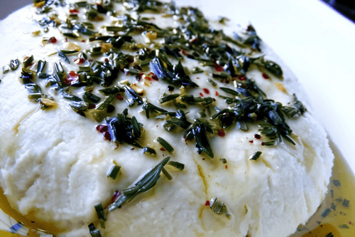 Bring 1/4 cup of olive oil and herbs to a boil over medium heat. Cool to room temperature and drizzle the mixture over the prepared cheese.