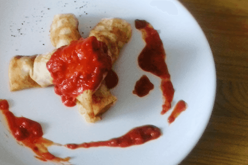 Place a small amount of meat in the pancake (try to avoid sauce). Fold the edges and wrap it. Do this for all pancakes.