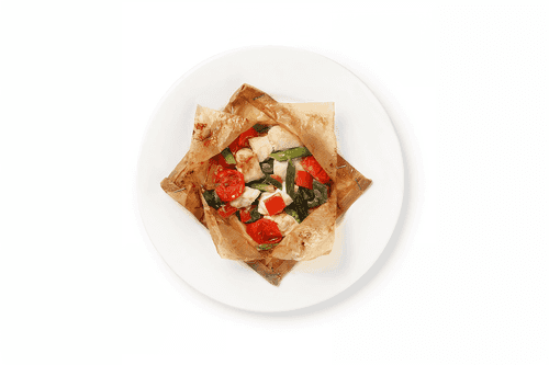 Frying in packets is an original way to prepare chicken in the traditions of European cuisine. The roots of the method can be found in the desire to preserve the juiciness of the meat while giving it a crispy crust. Wrapped in dense baking paper, chicken breast infused with the aromas of kaffir lime, green onion, and cherry turns into a tender dish rich in flavors. Frying gives the chicken an appetizing texture, while mushrooms complement the composition with earthy notes. The dish is perfect for dinner when you want to enjoy a harmonious blend of freshness and richness of taste. Serving in paper packets adds an element of surprise while keeping the aroma until opened. A simple yet striking way to cook chicken with minimal fat while preserving its natural flavor.