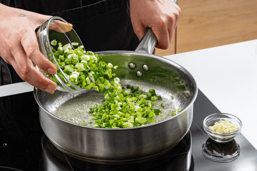 Chop the green onion and garlic. Slice the mushrooms thinly.