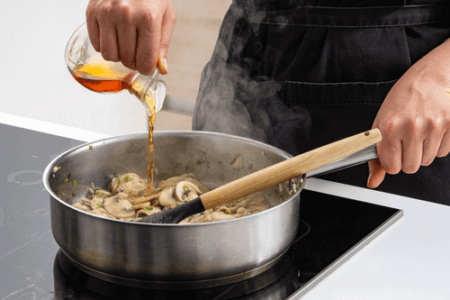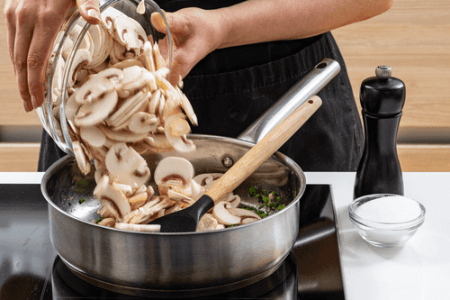 Add chopped mushrooms, season with salt and pepper. Simmer for five minutes.
