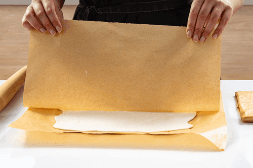 Divide the dough into two parts, roll both into squares slightly larger than the size of the pan. Hide in the refrigerator for half an hour. Preheat the oven to 180 degrees.