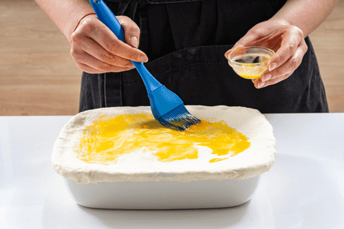Place filling on one layer of dough, cover with the second, seal the edges, brush the entire surface with beaten egg yolk, and make a hole for steam to escape. Bake for 45 minutes.