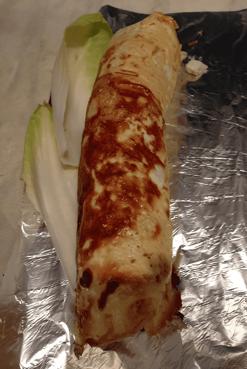 Cool the ready 'pancake', spread with cottage cheese, sprinkle with herbs, add fried mushrooms and finely chopped chicken fillet; season with pepper.