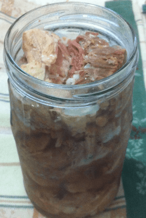 Fill the jars with meat with broth to the top. Seal with lids. Turn them upside down and let cool. Then you can put them in the refrigerator.
