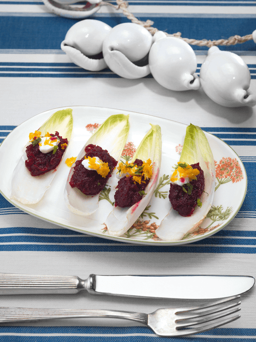Divide the chicory into leaves and arrange the most beautiful ones on a plate. Place a tablespoon of beet paste on each leaf, drizzle with yogurt, and garnish with cilantro leaves and orange zest.