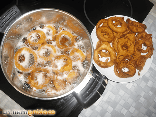 Fry the onion rings in small batches in a large amount of boiling refined sunflower oil over medium heat on both sides until golden brown.