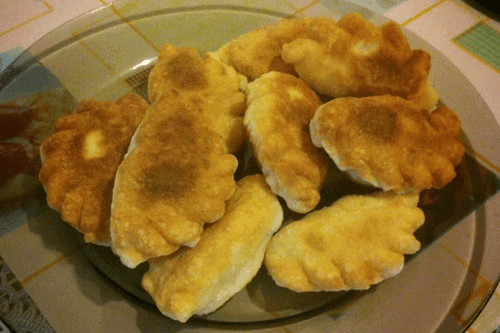 Fry in hot vegetable oil over medium heat on both sides until cooked. Caution: if the pie bursts, the oil will splatter!