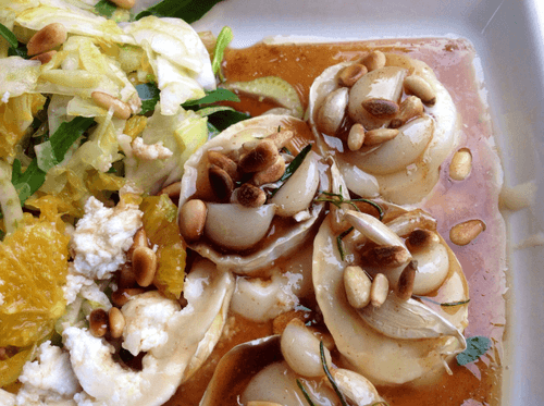 Gratinated goat cheese with honey and rosemary is an exquisite Italian dish that harmoniously combines the sweetness of honey, the rich aroma of rosemary, and the delicate texture of goat cheese. This recipe embodies the gastronomic traditions of the Mediterranean, where simple yet quality ingredients create a wonderful palette of flavors. Baked in the oven, the cheese develops a light crust, while the honey-balsamic syrup with hints of garlic and lemon adds depth and richness to the dish. Crunchy pine nuts provide a textural contrast, and fresh green salad highlights the sophistication of taste. It is an ideal option for a light dinner or elegant appetizer that will impress with its balance of sweet, salty, and spicy.