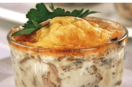 Mushroom stew with cream is a warm, rich dish of Russian cuisine infused with the aroma of forest mushrooms and creamy tenderness. Historically, mushrooms hold an important place in Russian gastronomy, especially in autumn when the gifts of the forest are gathered. In this recipe, they are complemented by savory ham, caramelized onions, and rich cream, creating a velvety texture and deep flavor. The finishing touch is a baked egg and melted cheese that adds softness and an appetizing golden crust to the dish. This stew is perfect for a cozy home dinner or festive table, delighting with its richness of flavors and heartiness. It is served hot and pairs excellently with rye bread or a glass of white wine.