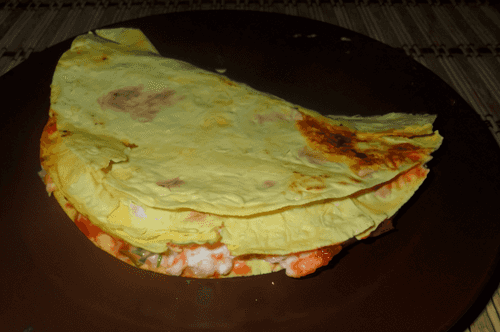 Heat the pan where the omelet was cooked (it can stay on the heat), place the tortilla in it, press down with your hand to flatten it, and fry on both sides.