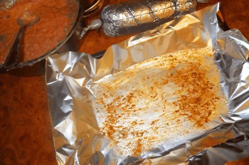 Lay out the foil, sprinkle with curry spices, pour half of the minced meat on one side, seal the edges and sides. Transfer to plastic wrap and tightly wrap several times. Tie the sides with string like a candy, wrap the sausage itself with string several times to evenly distribute the filling under pressure.