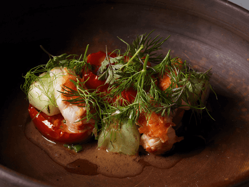 Crayfish with Baku tomatoes and fried cucumbers is a culinary masterpiece where Danish cuisine meets the sunny aromas of the East. Tender and juicy crayfish infused with fennel and carrot aroma gain rich flavor from the spicy broth. Baked Baku tomatoes add sweet and smoky notes, while fried cucumbers provide a light textural contrast. The dish is served with a thick sauce made from tomato juice and crayfish broth, seasoned with olive oil. The harmonious blend of freshness, sweetness, and umami makes it perfect for a festive dinner or gastronomic experiment. This recipe combines the tenderness of seafood with the richness of vegetable flavors, creating an exquisite and memorable dish that will surely captivate gourmets.