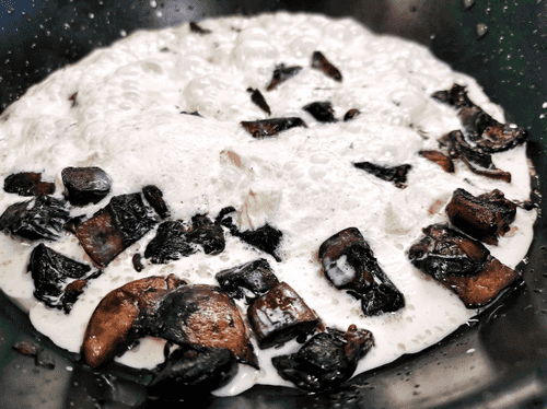 Cut the chicken breast into thin strips and fry. Fry the mushrooms and onions separately, add them to the fried breast, pour cream into the pan and bring to a boil.