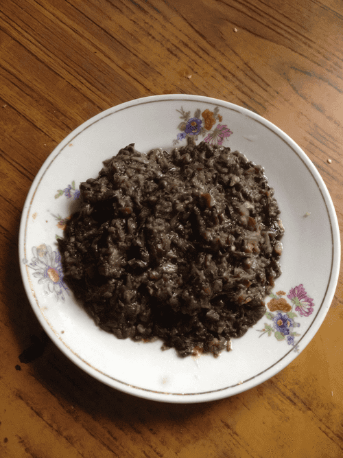 We let the onion simmer until fully cooked. When the onion is ready, we add salt, sugar, and vinegar. I use the simplest vinegar. It will serve as a preservative and allow the mushroom caviar to last in the fridge for several months.