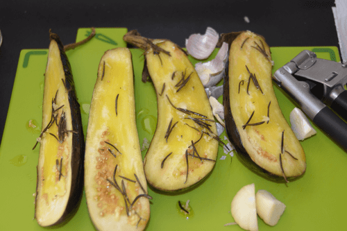 Place on parchment, putting sprigs of fresh rosemary between the halves of the eggplant.