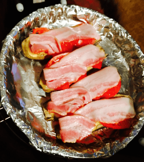 We also place tomato, bacon on top and cover everything with cheese.