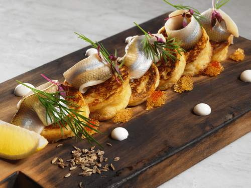 Place the smelt on the pancakes, garnish the dish with sauce and fresh dill.