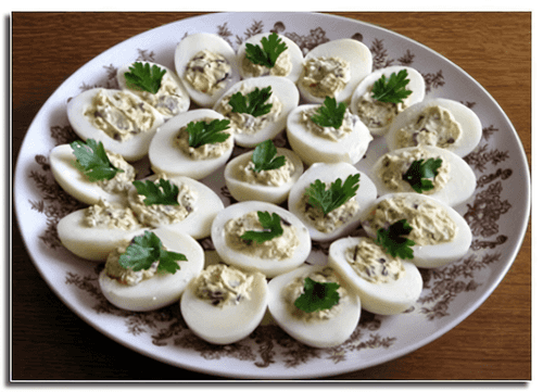 Stuffed cod liver eggs are a classic European dish that combines the tenderness of egg whites with the rich, buttery flavor of cod liver. This delicacy has long held a place in festive and everyday menus due to its simplicity and sophistication. Canned cod liver, with its rich, slightly briny taste, pairs beautifully with yolks, mayonnaise, and spices to create a light and delicate filling. The dish is often garnished with herbs or olives for added freshness and an elegant appearance. Stuffed eggs are perfect as an appetizer – they are nutritious yet light, and their creamy texture contrasts pleasantly with the firmness of the whites. This versatile dish can be served at both festive tables and in everyday menus, adding a touch of gastronomic elegance.