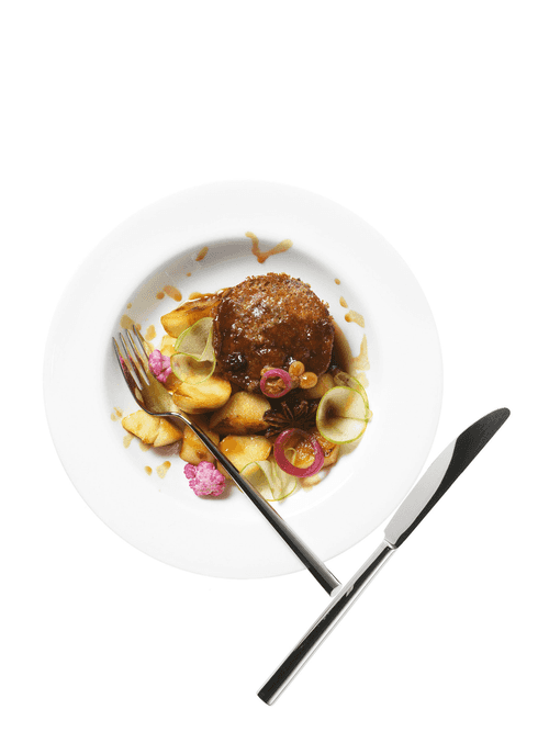 Remove seeds from the apples. Cut a quarter of one into very thin slices. Peel the others, cut them into large cubes, and fry in vegetable oil, adding star anise and a large pinch of sugar at the end.