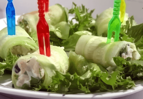 Slice the cucumber into thin strips using a vegetable peeler. Roll each strip into a small roll and fill it with the prepared filling. The rolls can be secured with a toothpick or skewer.