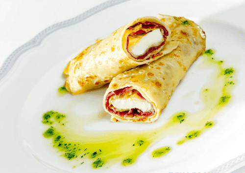On a greased pancake with olive oil, place ham, slices of Unagrande mozzarella, and basil. Roll it up and lightly fry in a well-heated pan with a little oil.