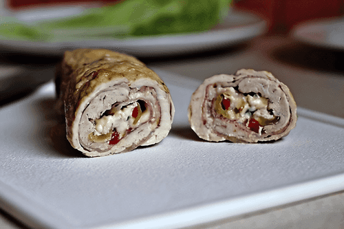 Chicken roll stuffed with cheese, bacon and pepper