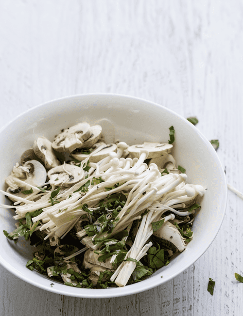 At this time, finely chop the mushroom caps and coarsely chop the enoki mushrooms. Finely chop the herbs (I used thyme and oregano). In a bowl, mix the mushrooms and herbs, drizzle with 2 tablespoons of olive oil.