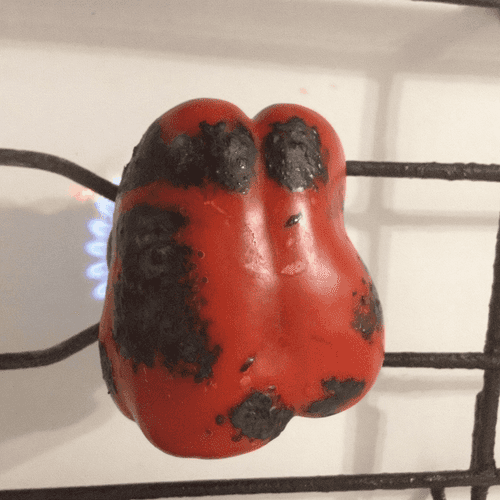 Turn on the burner to medium heat and place the pepper directly on the grate. It will blacken and may crack in places. Roast the pepper for 1-2 minutes on each side.