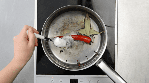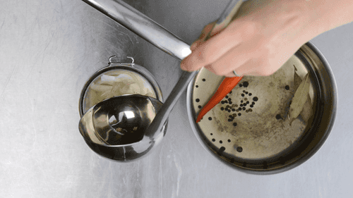 Mix water and vinegar. Add all spices except garlic and bring to a boil. Cool the marinade.