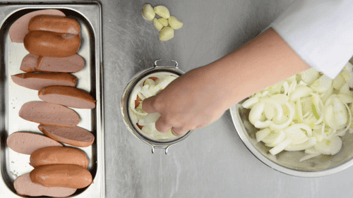 In a large jar, layer onions, then layer sausages, and another layer of onions. Continue until the jar is filled to ¾.