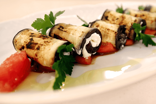 Generously spread eggplants with cream cheese, roll them into rolls, and place them in tomato boats. Garnish with green leaves.