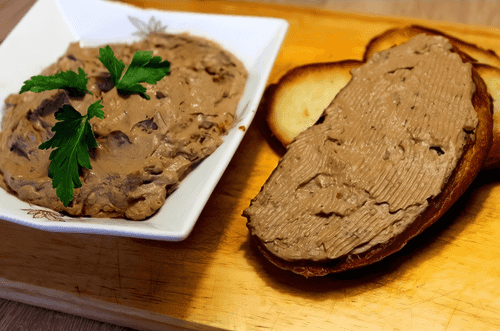 We transfer the resulting pâté to a convenient container and add the sautéed mushrooms to the mixture.