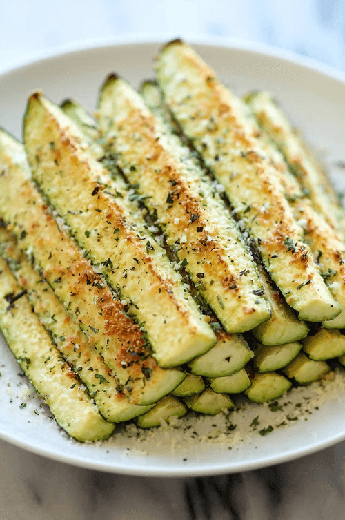 Slice the zucchini lengthwise and place on a baking sheet. Sprinkle with herbs, salt, and grated cheese.