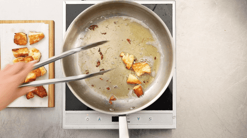 Pour olive oil into a thick-bottomed pan. Heat it over medium heat, avoiding smoke. Fry the cheese until it is covered with a beautiful golden crust.