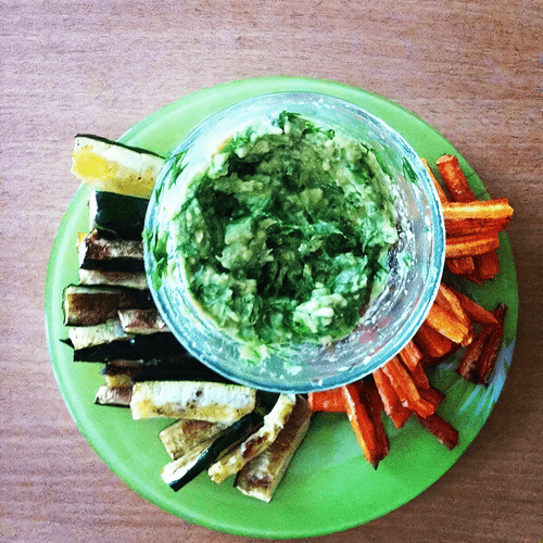 While the vegetables are baking, we prepare the sauce. You will need a very soft avocado for it. Cut the fruit in half, scoop out the flesh with a spoon, and place it in a bowl. Add lemon juice and mash until smooth. Chop the dill and mix it into the sauce.