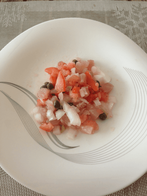 Tuna tartare with tomatoes and capers is a refined dish of French cuisine that combines the freshness of seafood and the spiciness of Mediterranean ingredients. Tartare originally emerged as a way to enjoy the natural flavor of raw meat, but in modern culinary art, it has become synonymous with lightness and sophistication. Tender tuna meat, carefully diced, harmonizes with juicy tomatoes, sharp onions, and tangy capers. Dressed with sesame oil and seasoned with salt and black pepper, this tartare acquires a layered taste where light sweetness, mild saltiness, and delicate spiciness blend together. The dish is perfect as an appetizer before the main dinner and can be served on crispy toasts or with chilled white wine that highlights the freshness of the tuna.