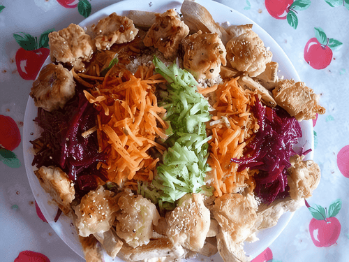 Grated Rainbow Vegetable Salad with Pancakes, Feta Cheese and Sesame by Jamie Oliver