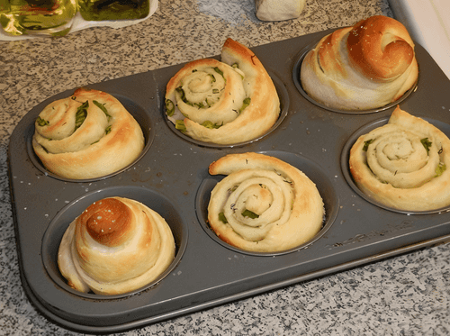 Roll the dough into a log and cut it into 6 equal parts. Place them in muffin tins. Sprinkle with salt.