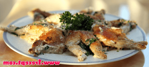 Sprinkle the prepared washed legs with salt and freshly ground black pepper (to taste), place them in a non-reactive enamel or ceramic dish and lightly marinate by drizzling with a bit of lemon juice and adding some dry white wine, crumbling 2-3 sprigs of thyme; for those who like, crushed garlic can be added. Cover and let marinate for half an hour.