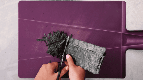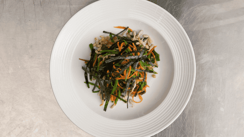 Mix well and add fresh green onions before serving. Decorate the plate with nuts, celery leaves, and seed sprouts. Sprinkle with thinly sliced nori seaweed on top.