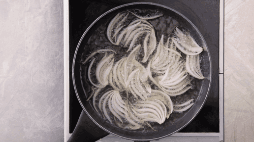 Cut the onion into large feathers, fry in well-heated vegetable oil, and immediately remove from heat. Leave in the oil for 7 minutes and strain (the oil can be used for dressing).