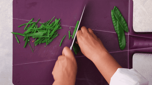 Blanch the green peas, cool them in ice, and cut into strips. Rinse the scallions and cut them into 10 cm lengths.