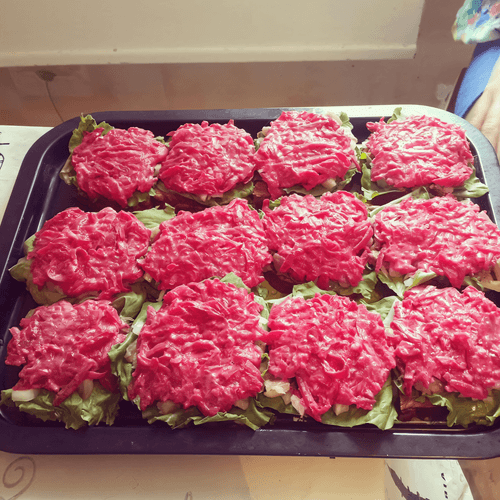 Slice the bread as you like :) Then place a lettuce leaf on a piece of bread, followed by herring with onion, and then beetroot. You can garnish with herbs if desired :)