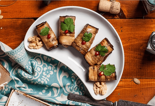 Eggplant rolls with nut paste and adjika are a refined dish of Georgian cuisine filled with Eastern aromas. It harmoniously combines the tender texture of fried eggplant, the richness of nut paste, and the spiciness of adjika. Walnuts add creaminess and a nutty note to the paste, while cilantro and parsley provide fresh herbal hints, and pomegranate seeds finish it off with a light tang. This appetizer is perfect for festive tables or friendly gatherings.